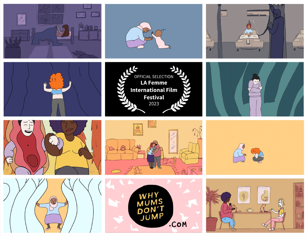 Why Mums Don’t Jump (2023) is a short animated film made by students at Falmouth University for their live-brief client Helen Ledwick, the creator of Why Mums Don’t Jump. The efforts of the students were rewarded; making official selection at La Femme International Film Festival and being interviewed on HollywoodLIVE Today by Aaron Michael Sanchez.